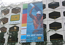Olympia 2012 Zwei Banner mit dem Logo der Olympia-Bewerbung von Düsseldorf Rhein-Ruhr schmücken das Parkhaus der Düsseldorfer Stadttochter IDR am Carlsplatz in Düsseldorf. Das erste Motiv zeigte einen Läufer, auf dem zweiten Banner ist ein Schwimmer zu sehen. Im unteren Teil des Sportlermotivs ist das IDR-Logo angeordnet, daneben der Leitspruch: "Wir sind dabei". |
