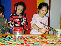 Weihnachtsbäckerei: Anläßlich der Eröffnung unserer "Turnschuh-Ausstellung" - zu sehen vom 19.12. bis 19.01.2003 im Deutschen Sport- und Olympia Museum in Köln - startete eine weitere farbenfohe Aktion von "Wettlauf der Farben", der Kinder- und Jugendaktion der drr 2012 GmbH.Diesmal hieß es: Vor freude auf Olympia! Vor freude auf Weihnachten... Unter fachmännischer Anleitung von zwei Meistern der Kölner Konditorei "Printen Schmitz" backten über 40 Kinder aus 9 Nationen - Schüler/innen der Grundschule Alzeyer Straße aus Köln-Bilderstöckchen - selbst gemachte Weihnachtsplätzchen. Die Kekse wurden mit buntem Puderzucker in den Originalfarben der Olympiabewerbung angemalt. |