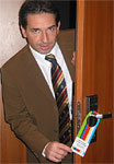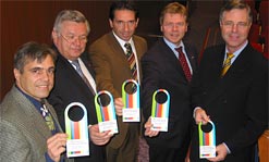 Bonner Presseball Die Düsseldorf Rhein-Ruhr 2012 GmbH präsentierte sich am Freitag, dem 13. Dezember 2002 auf dem Internationalen Bonner Presseball im Maritim-Hotel mit ihrem Informationsstand, den nicht nur eine große Zahl der mehr als 3.200 Ball-Gäste, sondern auch NRW-Ministerpräsident Peer Steinbrück besuchte. Zu den zahlreichen prominenten Trägern des begehrten bunten Pins der Olympiabewerbung von Düsseldorf Rhein-Ruhr gehören nun auch Schauspieler Peer Augustinski, FDP-Vorsitzender Guido Westerwelle sowie Lindenstraßen-Darsteller Willy Herren. |