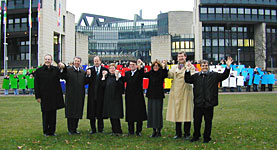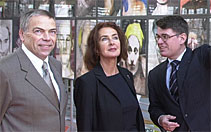 im Düsseldorfer Stadttor Am Dienstag, dem 26. November 2002 eröffneten Manfred Morgenstern, Staatssekretär Ministerium für Städtebau und Wohnen, Kultur und Sport (links), und Joachim Erwin, Oberbürgermeister der Landeshauptstadt Düsseldorf (rechts), im oberen Foyer der Staatskanzlei NRW die Ausstellung "XENOI - Fremde, Gäste" der Künstlerin Caterina Albert. Das Thema der Kunstwerke passt besonders gut zum Motto der Olympiabewerbung von Düsseldorf Rhein-Ruhr: "Unsere Spiele - so bunt wie die Welt". Im Jahr 2012 sollen Fremde aus allen Ländern der Welt als Gäste in der Metropole Düsseldorf Rhein-Ruhr empfangen werden und gemeinsam das große Fest der Olympischen Spiele feiern. Deshalb präsentiert die Düsseldorf Rhein-Ruhr 2012 GmbH diese Ausstellung. |