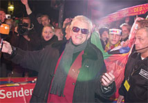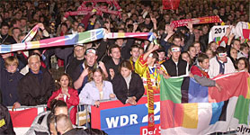in Düsseldorf! 60 000 begeisterte Düsseldorfer kamen auf die Kö "Wetten, dass es die Düsseldorfer nicht schaffen, auf der Kö in einer Länge von 640 Metern die längste Theke der Welt mit allen möglichen Tischen aufzustellen?" Die Stadtwette forderte die Düsseldorfer heraus, und Gottschalk verlor haushoch. Nach gerade mal 15 Minuten knarrten die ersten Tische auf die Königsallee. Sie kamen mit Schul-, Tapezier-, Steh- und Esstischen, mit Wickeltischen und Bügelbrettern. Immer dabei das Thema Olympia an Rhein und Ruhr. Sogar die Kö-Theke wurde mit dem Logo der Olympiabewerbung geschmückt. Auch Heino, gebürtiger Düsseldorfer, ist begeistert von der Idee Olympische Spiele 2012 in Düsseldorf Rhein-Ruhr. Heino unterstützte die Düsseldorfer musikalisch von der Bühne aus und versetzte seine Fans in Schunkelstimmung. |