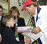 bei der Veltins Biathlon Wold Team Challenge 2002 Mit der Veltins Biathlon WTC 02, der Mixed-Staffel-Sprint der weltbesten Elite, holte die Arena AufSchalke am 28. Dezember 2002 die Alpen einen Tag lang ins Ruhrgebiet. Ein erstklassiges Teilnehmerfeld sorgte für hochkarätigen Sport und jede Menge Spannung. Die sportlich spektakuläre Veranstaltung wurde eingebunden in eine "Schneeparty" mit Sport, Spaß und Spiel für die ganze Familie. Natürlich nutzte die Düsseldorf Rhein-Ruhr 2012 GmbH diesen einzigartigen Sportevent, um über die Bewerbung von Düsseldorf Rhein-Ruhr für die Olympischen Spiele 2012 zu informieren. Unterstützt wurde sie u. a. durch die "Olympiabotschafter" Frank Busemann, Zehnkampf-Silbermedaillen-Gewinner bei den Olympischen Spielen in Atlanta, und Thomas Domian, Ruder-Olympiasieger in Seoul. Darüber hinaus überraschte die Düsseldorf Rhein-Ruhr 2012 GmbH mit einer 2,5 mal 2,5 Meter großen "Olympia-Eistorte". |