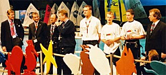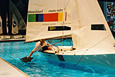 Leinen los! Auf der BOOT 2003 - Olympische 470er Präsentation mit Live-Talk Wer wagt, gewinnt! So eine große Jolle wie die 470er traute sich noch nie ins Aktionsbecken der BOOT. Gefragt: Kluge Manöver auf engstem Raum. Im Rahmen der Kinder- und Jugendaktion der drr2012 GmbH "Wettlauf der Farben" demonstriert ein Jugendteam der deutschen Klassenvereinigung der olympischen 470er, angeführt von Christian Lindemann (19 Jahre) seglerisches Können und Vorfreude auf Olympia (www.470er.de). Sie manövrieren die große Rennjolle und fischten dabei munter nach dem farbenfrohen Signet der Olympiabewerbung Düsseldorf Rhein-Ruhr 2012. Die Segelaktion begleitete auf der Bühne eine Talkrunde mit Horst Klosterkemper (Geschäftsführer der Messe Düsseldorf und Vorsitzender des Bewerbungskomitess), den Düsseldorfer Olympiabotschaftern Curt Noel (Segelkader FDM Montral 76) und Philipp Stuer (Ruderweltmeister im 4er) und Rüdiger Schuchardt (Präsident der 470er Klassenvereinigung). |