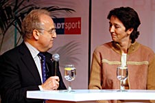 v.l. Olympia-Bronzemedaillengewinner und "Olympiabotschafter" Christian Keller, Nadine Capellmann, Dressur-Goldmedaillengewinnerin in Sydney (Mannschaft) und WDR-Moderator Peter Großmann. | ![]() |