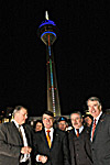 Parlamentarischer Abend "Olympia im Landtag" Um 19.00 Uhr eröffnete der Landtags-Vizepräsident Dr. Helmut Linssen am 19. Februar den Parlamentarischen Abend im Landtag. Anschließend diskutierten in einer Talkrunde zum Thema "Olympia-Bewerbung - Ein Konjunkturprogramm für den Sport" u. a. Gisela Hinnemann MdL, Vorsitzende des NRW Sportausschusses, NRW-Sportminister Dr. Michael Vesper, Joachim Erwin, Oberbürgermeister der Landeshauptstadt Düsseldorf, Horst Klosterkemper, Präsident des Bewerbungskomitees der Düsseldorf Rhein-Ruhr 2012 GmbH und "Olympiabotschafter" Christian Keller. Nach der Talkrunde gaben Ministerpräsident Peer Steinbrück, Dr. Michael Vesper, Joachim Erwin, Dr. Edmund Spohr, Vorsitzender der Aktionsgemeinschaft Düsseldorfer Heimat- und Bürgervereiner, die Künstler Horst Baumann und Nemo sowie IDR-Chef Dr. Heinrich Pröpper den Startschuss für die "olympische Beleuchtung" des benachbarten Rheinturms. Die Lampen der digitalen Uhrzeitanzeige am Rheinturm sind durch Leuchtdioden ersetzt worden, die auch farbiges Licht ermöglichen. Alle zehn Minuten leuchten die 62 "Bullaugen" nun in den Farben des Olympia-Logos. |