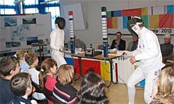 Aktionstag im Tannenbusch-Gymnasium Bonn zur Olympiabewerbung für 2012 Im Rahmen eines Schulaktionstages am Tannenbusch-Gymnasium in Bonn fanden am 10. Februar 2003 zahlreiche Aktionen zum Thema "Olympiabewerbung 2012 in Düsseldorf Rhein-Ruhr" statt. Heide Ecker Rosendahl, Doppel-Olympiasiegerin von 1972 und Präsidentin des Bewerbungskomitees, Oliver Lücke, WM-Bronzemedaillengewinner im Degenfechten und "Olympiabotschafter" für Düsseldorf Rhein-Ruhr, Sigrid Hein, Präsidentin des Olympischen Fechtclubs Bonn, und der Leiter des Gymnasiums, Wolf-Dieter Hellberg, diskutierten im Olympia-Talk über die Vorteile einer Bewerbung für die Region. Im Anschluss standen Heide Ecker-Rosendahl und Oliver Lücke zu Autogrammstunde und Foto-Shooting zur Verfügung. |
