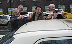 Foto v. l.: Rolf Sebetzky, Vorstandsvorsitzender der Taxi-Düsseldorf eG, Andreas Niederberger, "Olympiabotschafter" und ehemaliger Eishockey-Nationalspieler, Michael Zilles, Geschäftsführer der Düsseldorf Rhein-Ruhr 2012 GmbH und Taxifahrer Siegfried Fuchs. | ![]() |